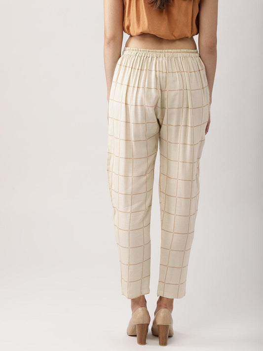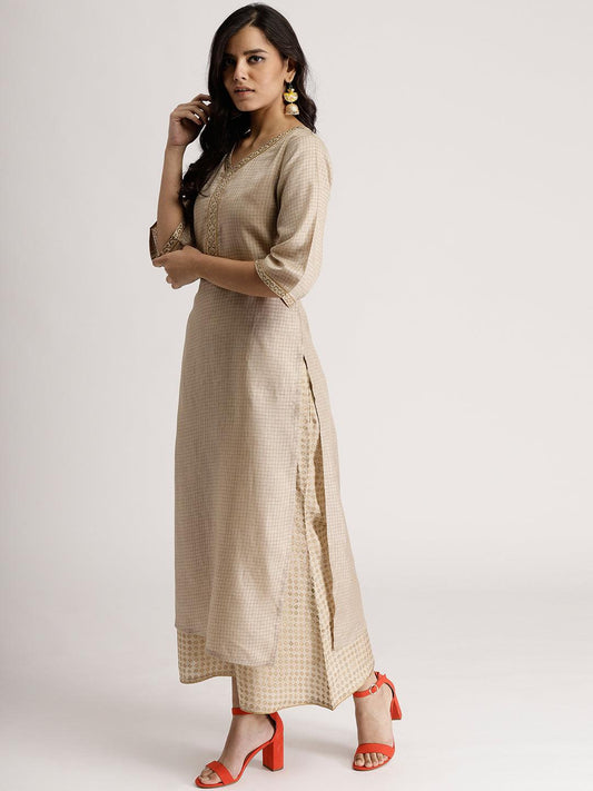 Beige Checkered Chanderi Silk Straight Kurta With Palazzos