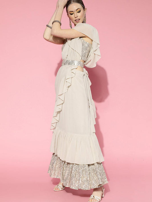 Beige Embroidered Chanderi Silk A-Line Kurta With Palazzos & Dupatta
