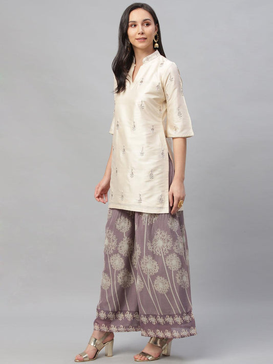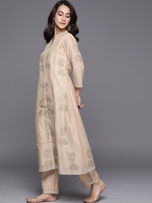 Beige Embroidered Chanderi Silk Straight Kurta With Palazzos